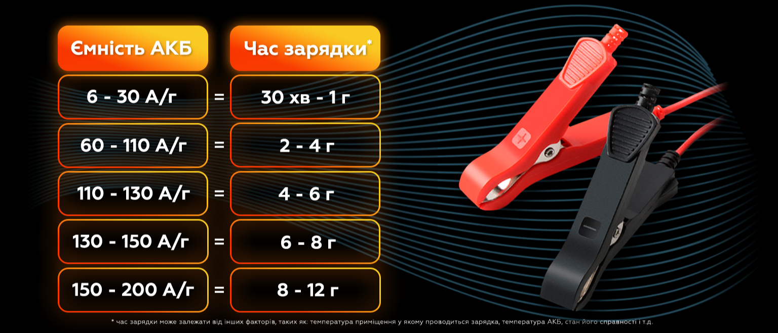 Пристрій має змогу зарядити всі популярні та розповсюджені типи АКБ, які широко використовуються у легковому транспорті, мотоциклах та навіть моторних човнах.